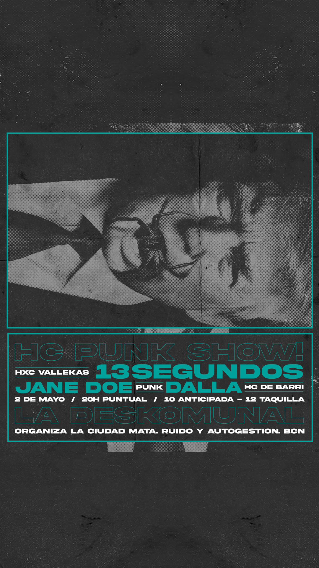 13segundos venen a Barcelona per primera vegada a rebentar La Deskomunal. Punk rock des del més profund de Vallekas, ràpid, consistent i compromès. Corazon del Sapo, Zinc, o The Bronx te’ls trobaràs a la seva música, que acompanya unes lletres fosques, introspectives i polítiques plenes de bones melodies i tornades. Si no els has vist als seu directes s’asseguraran que no ho oblidis.