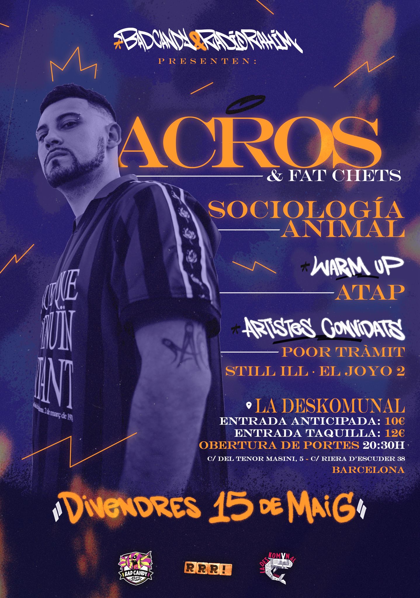 El raper barceloní Acros arriba a la Deskomunal acompanyat per en Fat Chets als plats en una nit que promet pur hip-hop amb segell local i uns convidats increïbles. Prepara’t per a una actuació intensa on l’estil hardcore i el missatge seran els protagonistes.
