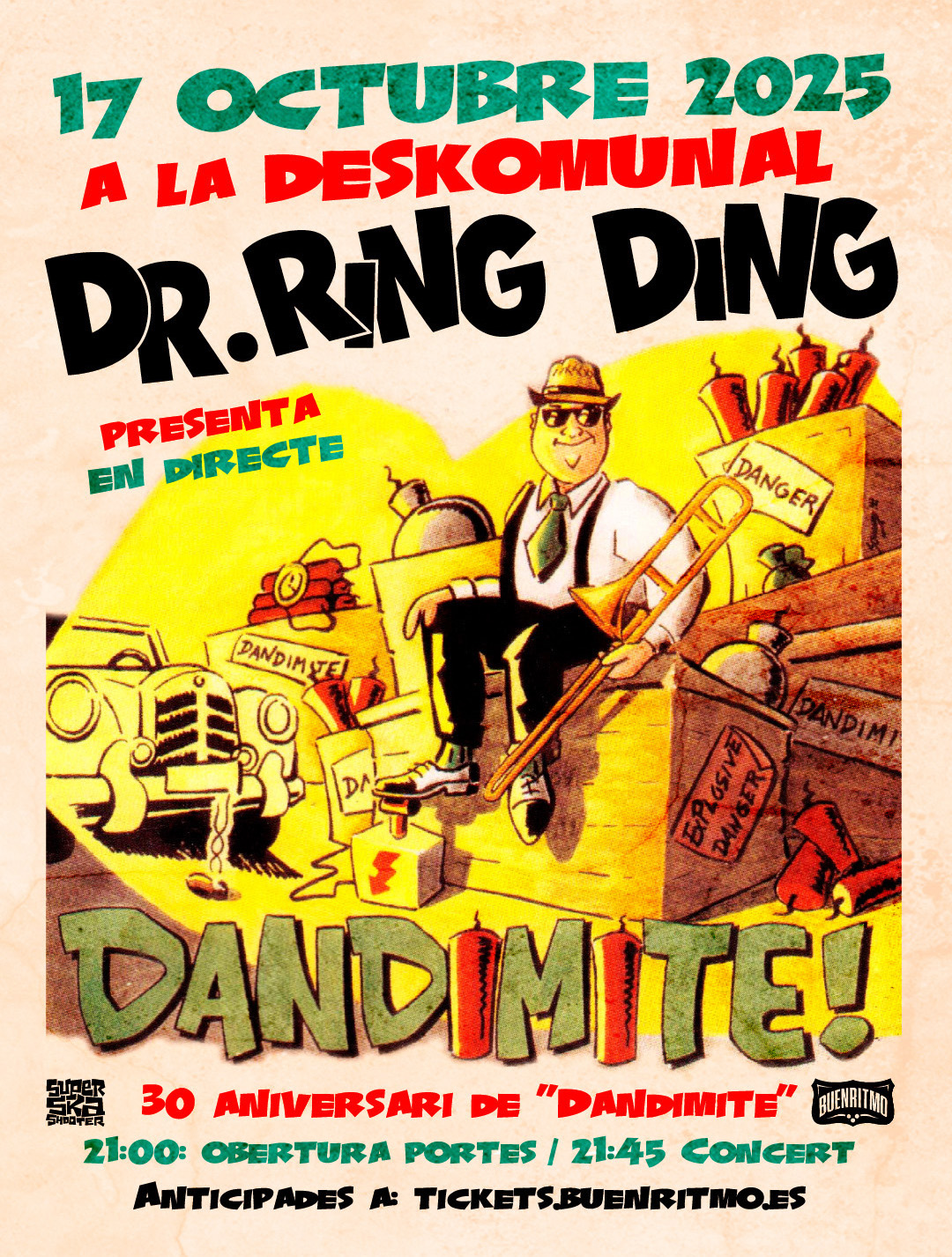 Dr. Ring Ding celebra el 30è aniversari de ‘Dandimite!’, el seu disc de 1995 que ha esdevingut un clàssic de l’escena global de l’ska. Amb una formació de 7 músics, composta pels seus companys de tota la vida i alguns joves talents de diferents països, Dr. Ring Ding interpretarà el disc complet, així com una selecció dels millors temes del seu catàleg.