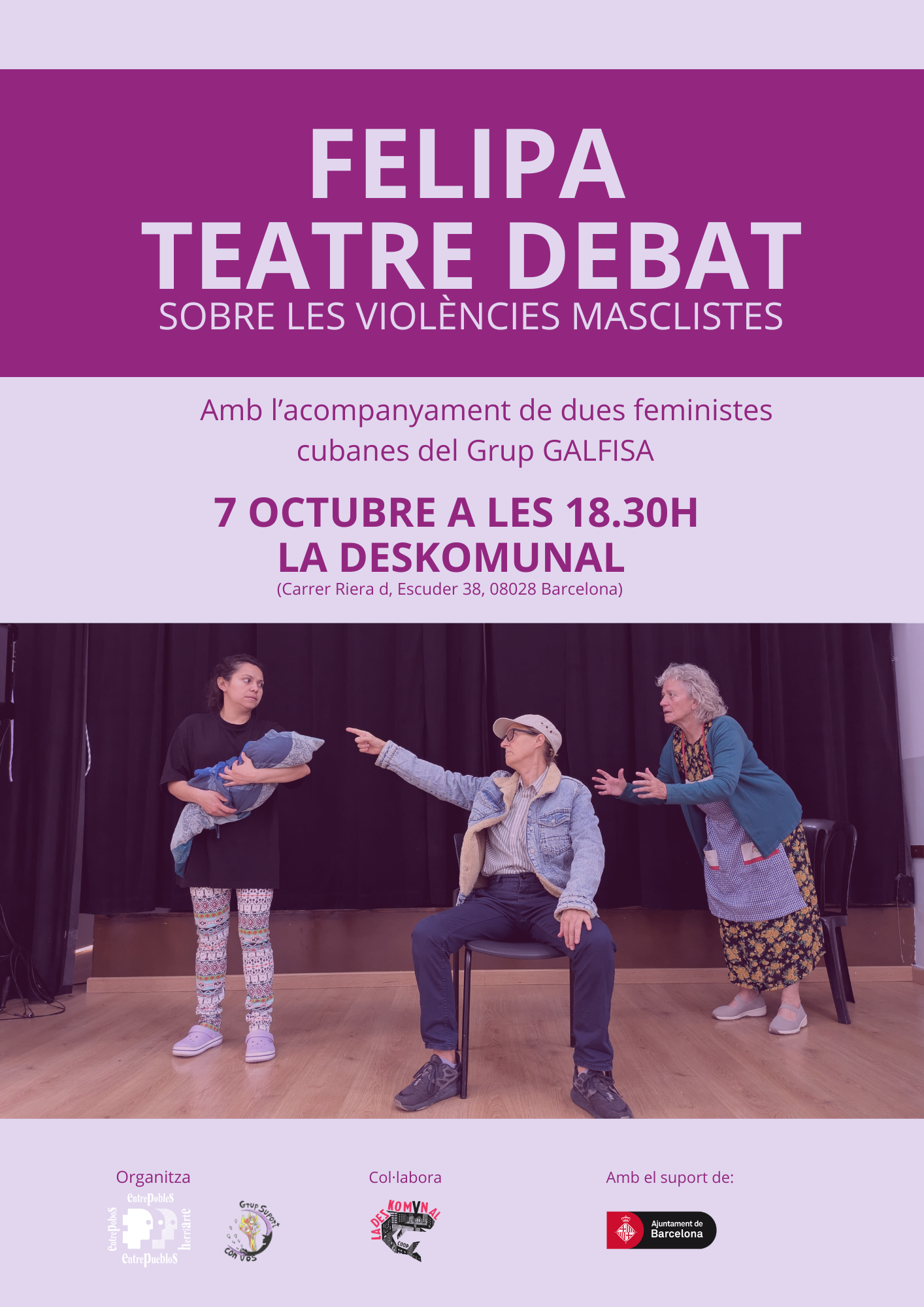 El proper 7 d’octubre a les 18.30h, l’Associació Entrepobles i el Grupo con Vos presenten Felipa, una obra de teatre social feminista sobre les violències masclistes.