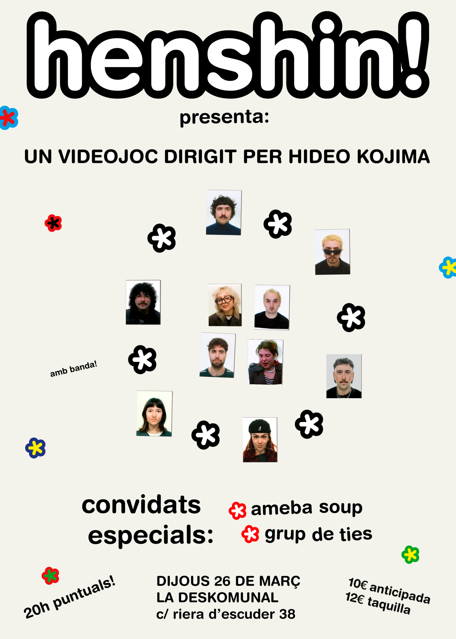 Henshin! són un quartet de Barna que estaran presentant el seu primer LP: Un Videojoc Dirigit per Hideo Kojima. Un àlbum que combina emo, shoegaze i indie rock amb instrumentals afilats i veus dolces que es veuen potenciats en un directe enèrgic i sorollós.