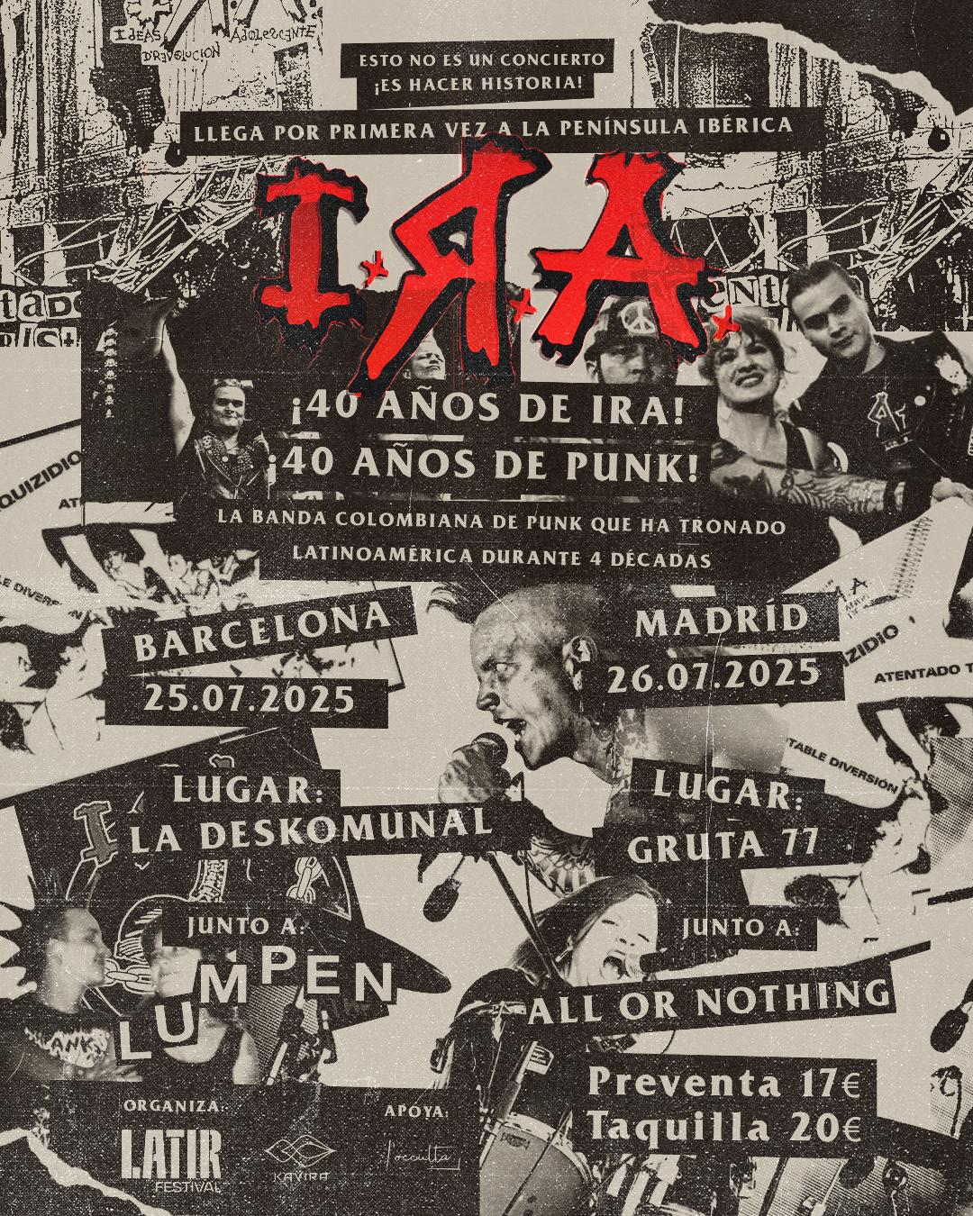 I.R.A. és un banda colombiana de punk – hardcore amb 40 anys de feina a les seves esquenes. Tindrem el plaer de gaudir de la seva història junt als valencians LUMPEN, punk clàssic amb influències de garage i rock.