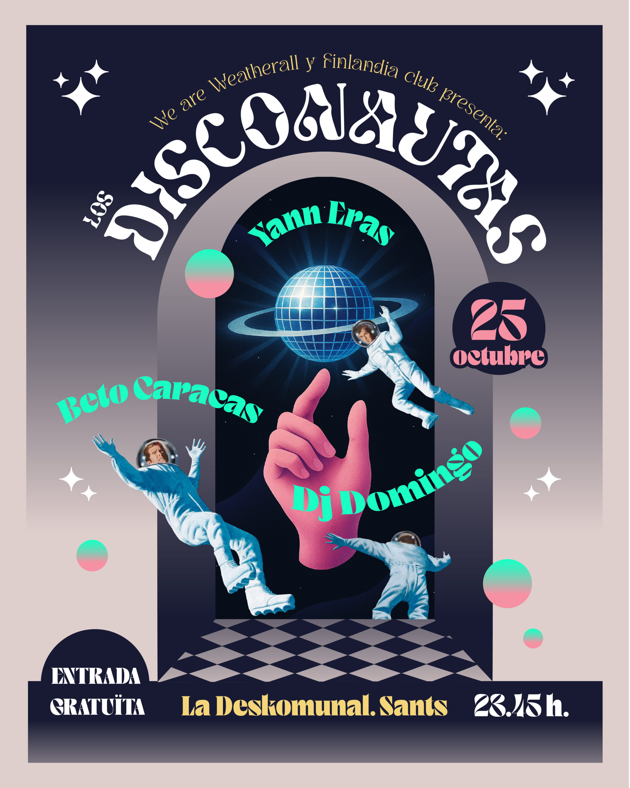 Finlàndia club torna al barri on va néixer ara fa més de 20 anys. En aquesta ocasió es reuneix amb el col.lectiu de les festes We are Weatherall per muntar una sessió espacial de ritmes electrònics sota el nom de Los Disconautas. On es viatjarà entre melodies i bombes varies de Dark Disco, Italo, música Disco i les ensenyances que ens va deixar el nostre Mestre Dj Andrew Weatherall.