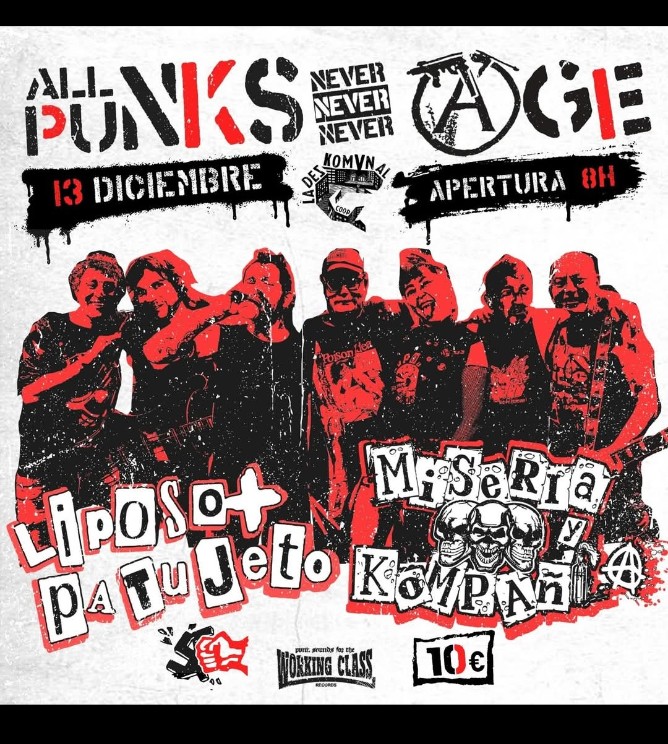 Propers als 40 anys d’existència MISERIA Y KOMPAÑIA mantenen intacta la velocitat, la ira i tota la ràbia acumulada. Tornen a descarregar a aquesta casa, a la DESKOMUNAL de BCN aquest cop molt ben acompanyats dels LIPOSO+PA TU JETO en una noche que promet bones emocions.