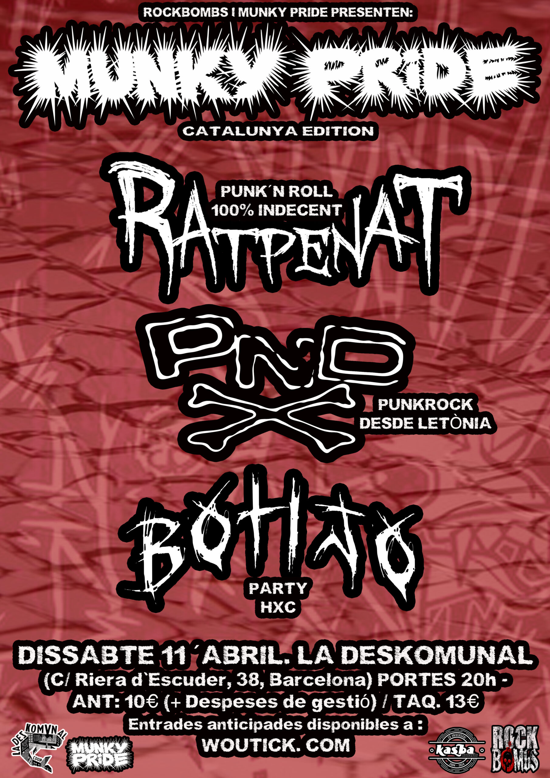 El pròxim dissabte 11 d’abril tindrem un concert molt especial. El Festival MUNKY PRIDE de Letònia aterra a La Deskomunal amb un concert molt especial. Els RATPENAT tornen amb el seu Punk’n’Roll 100% Indecent, i per primer cop a Catalunya, tindrem als PND, un referent del punkrock letó. I per començar als inconfundibles BOTIJO amb la seva festa Hardcore